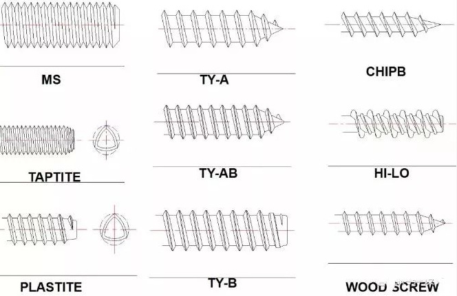自攻螺紋:裝配時先在裝配物上鉆孔,不需攻內(nèi)牙,使用較大力矩裝配。