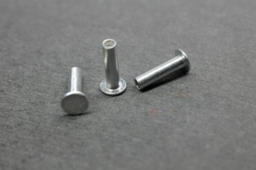 另外,還有對插鉚釘,比較特殊。分為兩部分,較粗的一段帶帽桿體中心有孔,與較細(xì)的另一段帶帽桿體是過盈配合。鉚接時,將細(xì)桿打入粗桿即可。